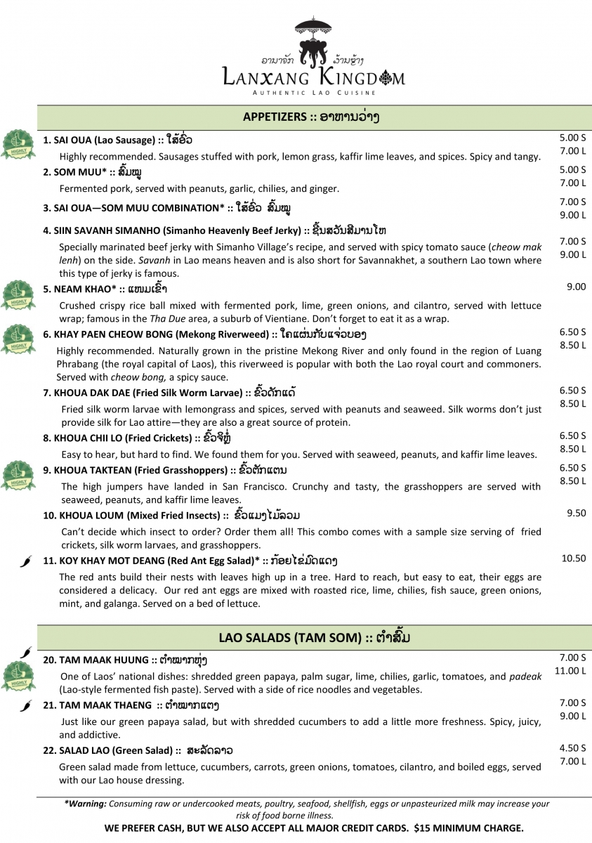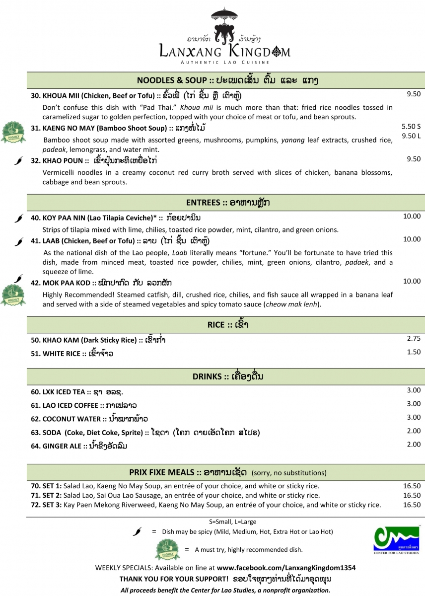 As a way to support restaurant owners and promote Lao food, CLS will translate menu items (Lao dishes only) into the Lao language FREE of CHARGE. If you are interested in adding Lao writing to your menu, please send a copy in Word Doc, Photoshop or Publisher format to info@laostudies.org. Please allow 7 days turn-around.