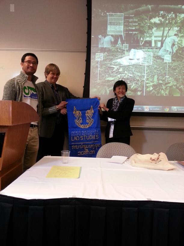 The closing ceremony took place on Sunday morning from 12:40-1:00pm, with remarks and appreciations from Co-Chairs Ian Baird and Vinya Sysamouth. Following, Dr. Baird spoke about the passing of Roger Rumpf, who played an important role in Laos in the late 1970s as the representative of Quaker Service Laos (together with his wife Jacqui Chagnon), and up until recently, and Dr. Katherine Bowie, Director of the Center for Southeast Asian Studies (CSEAS) at UW-Madison, who talked about the CSEAS and provided insight on how ICLS participants could make the most of their visit in the city of Madison. This was followed by the official passing of the gold thread-embroidered flag of the Lao Studies conference logo (made by Tiao Somsanith Nithakhong) from the current Conference host to the next Conference host: Thammasat University, Bangkok, Thailand. Dr. Varisa Kamalanavin, gave an acceptance speech and showed a video about Thammasat University. The Center for Lao Studies and Thammasat University will work closely together to organize the next conference in 2016.